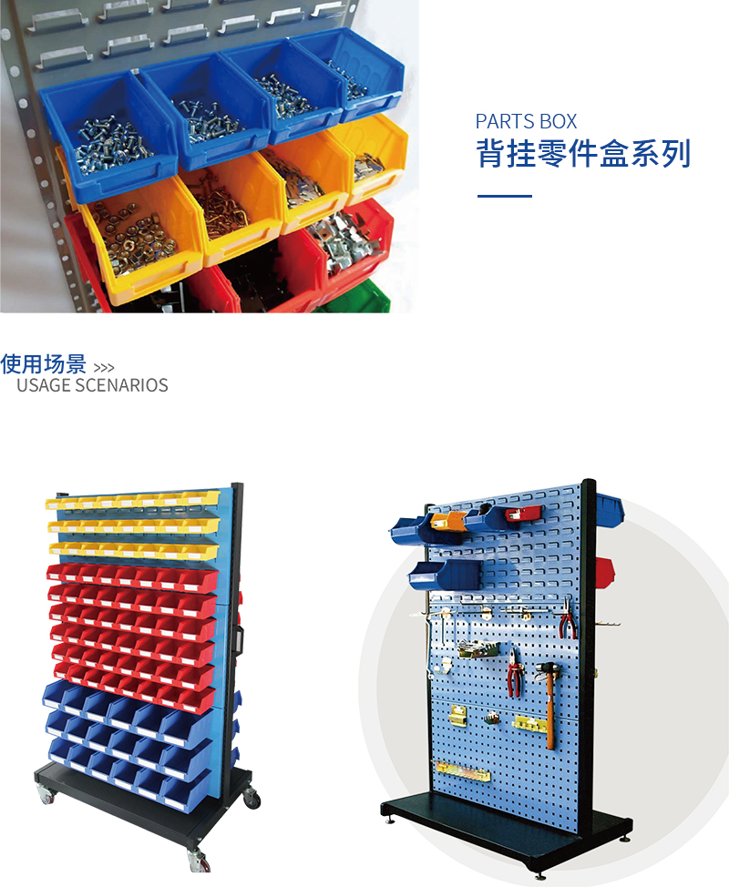 背掛零件盒采用全新共聚PP料制作,背后有掛槽設(shè)計(jì),可懸掛于物料整理架和工作臺(tái)的掛板上使用。共5種規(guī)格,有紅、黃、藍(lán)3種顏色庫(kù)存。